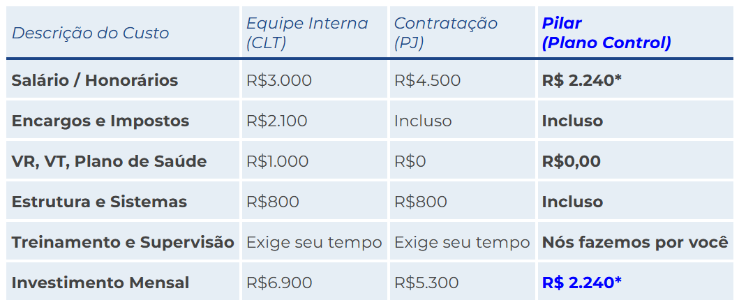 “Tenha a clareza e a segurança em seu financeiro com a Pilar, investindo uma fração do que custa um funcionário interno CLT ou PJ, e economize até R$ 56.000,00 por ano.”